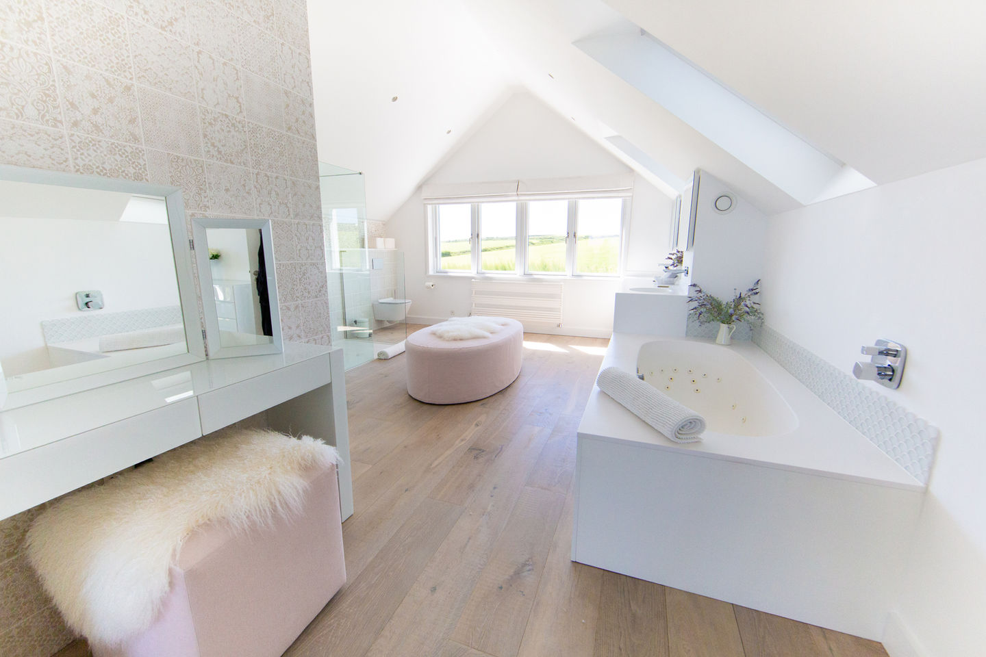 The master bedroom ensuite stretches from front to rear. A super comfortable super king size bed where you can lie and look at the sea is at one end and at the other is the bath and washbasins in a flow of Corian. We also have a large walk in shower with controls at one end so you don’t get wet when it turns on. The glass-covered dressing table sits against the floor to ceiling, lace-tiled wall, adjacent to a gorgeous, pink, oval ottoman.